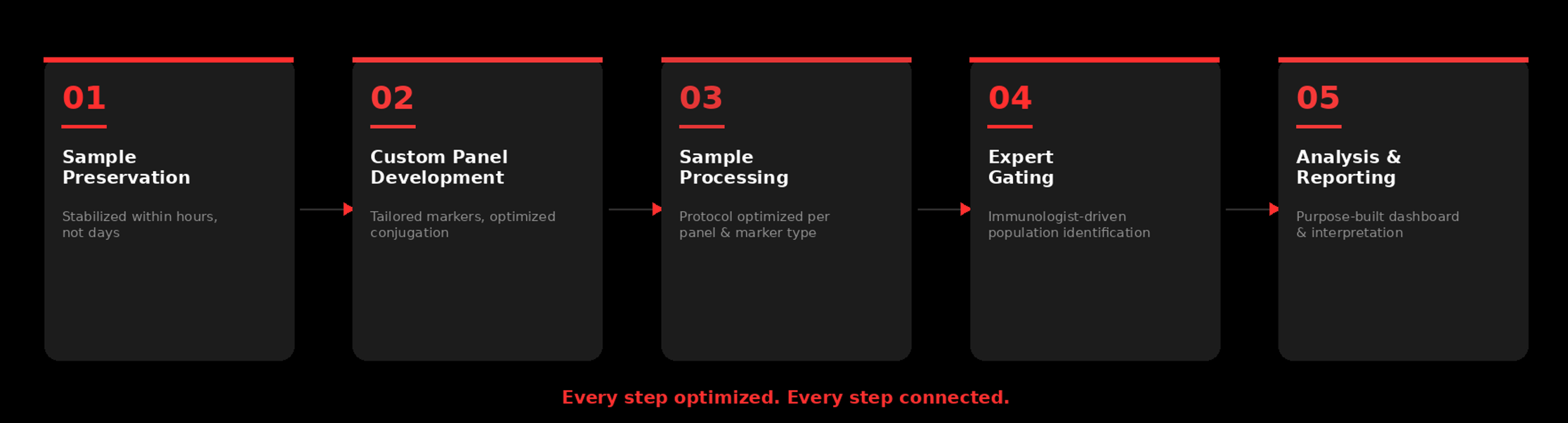 Processing protocols have to be optimized around the panel. Surface, intracellular, and signaling proteins each have different staining requirements. Signal-to-noise needs to be maximized across the full marker set. A cookie-cutter protocol doesn’t get this right.