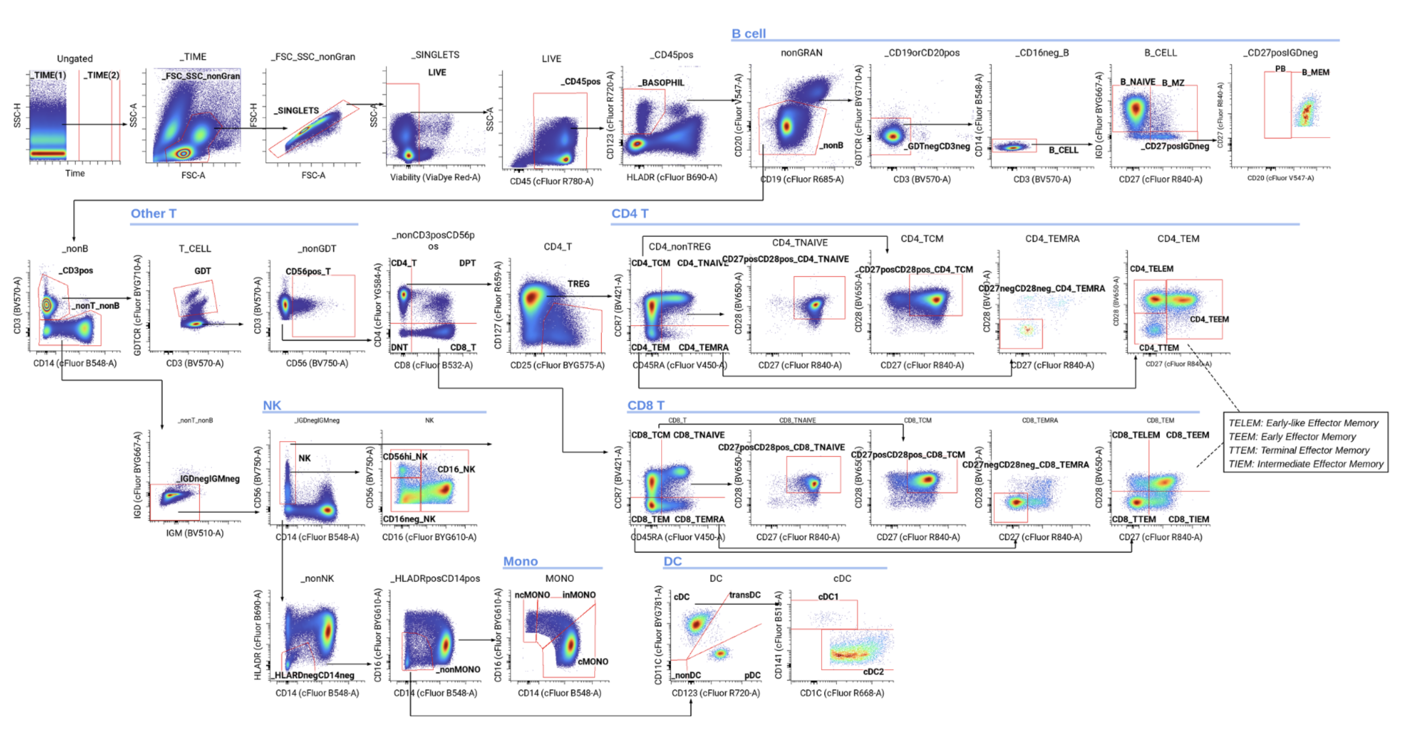 The result is a high-dimensional dataset in the form of an .FCS file (Flow Cytometry Standard). For every single cell in the sample, you know which proteins were detected and how much of each was expressed. From there, you can identify cell populations through a process called gating, where two-dimensional bi-axial plots are used to distinguish cells based on their presence or absence of markers, two markers at a time (image below). This process quantifies immune cell frequencies and assesses their functional states. Sets of surface and intracellular markers tell you what kind of cell it is. Functional markers (like Granzyme B, CD69, and PD-1) reveal the state of the cell and what it’s doing. Signaling markers, like phosphorylation states, show what pathways are active most acutely. And you can query all of this simultaneously: modern cytometry assays using mass cytometry or full-spectral flow cytometry measure 40 to 50 or more markers at once, with every marker measured on every cell.